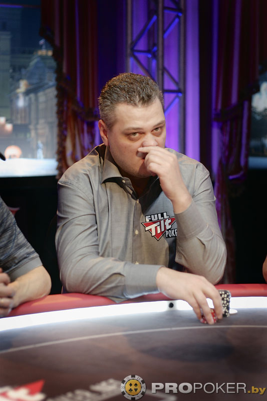 Сразу не заладилась игра у Сергея Рыбаченко и Виталия Лункина. Лункин проиграл большой банк с королями, ворвавшись в две пары Руслана Котельникова. При этом Виталию еще повезло — он собирался переставлять Руслана в олл-ин, но со словами: «Ты же все равно скинешь» просто заколлировал крупную ставку соперника на ривере. В переплет попал и Сергей Рыбаченко. Его рейз из ранней позиции поддержал Константин Пучков. На флопе 5
