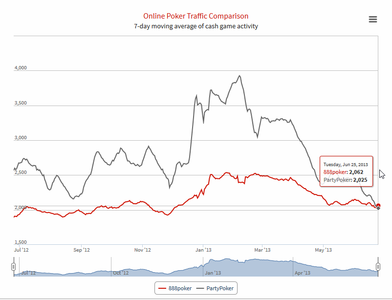 Согласно данным PokerScout, 888 обошли Party по показателям среднесуточной посещаемости за кэш-столами. Согласно последним сводкам с поля боя, среднесуточная посещаемость Party находится на отметке в 2 025 игроков, а 888 — 2 062. Такой низкий показатель в истории Party, некогда крупнейшего рума в мире, наблюдается впервые.