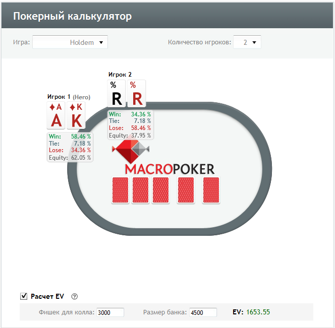 Калькулятор Macropoker – первый онлайн-калькулятор с расчетом шансов против диапазона рук. 6 разновидностей покера, удобное заполнение, возможность выбрать мертвые карты, текстовый вывод результатов расчетов, - всё это есть в нашем калькуляторе.