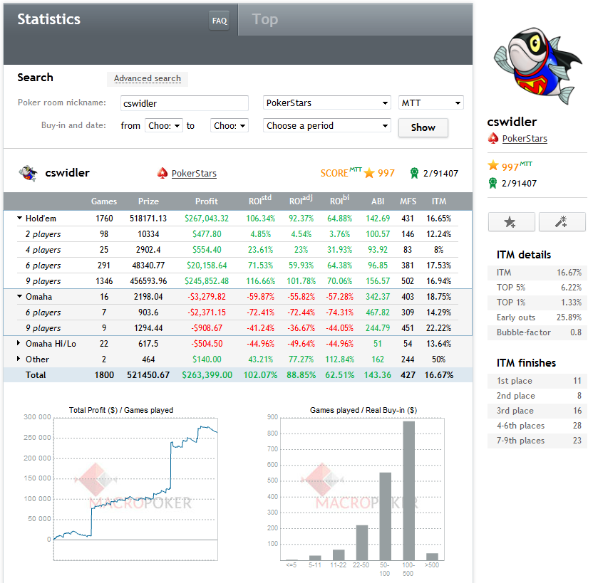 Macropoker.com от этих сайтов – бесплатная база данных результатов игроков в Sit'n'go и МТТ на трех языках, включая русский, уникальные статистические показатели и более удобный интерфейс.