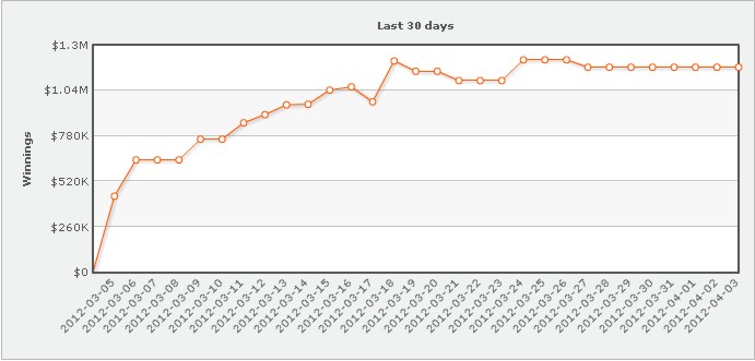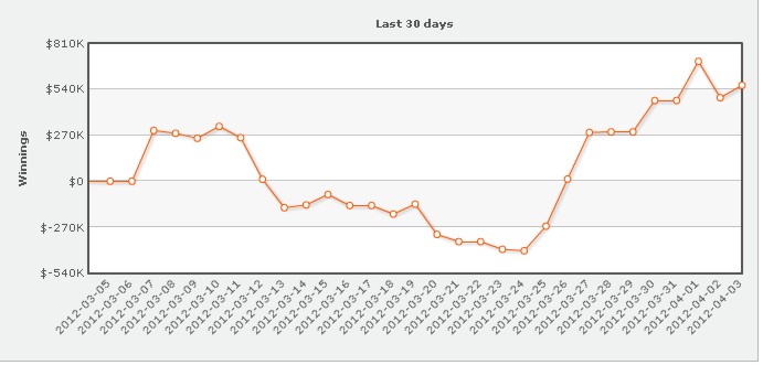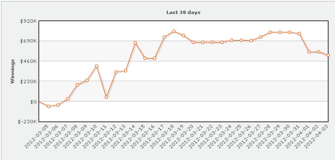 Заключительные дни месяца выдались чрезвычайно насыщенными, за последние десять дней месяца финн Илари Сахамиес выиграл $827 000, основным источником пополнения его банкрола стали столы для омахи пот-лимит $100\200 и $200\400. Остальные заметно подотстали, второй результат ($190 000) на счету у Ронни Кайзера. Существенный вклад в банкролл Сахамиеса сделал призёр праздничного Sunday Million под ником blodders03 (-$315 000), но жалеть его не стоит, часть выигрыша (~$165 000) всё-таки осталась при нём. Существенные потери понёс также Айзек Хакстон, его деньги поступили на надёжное хранение в банкролл Исильдура, который в первых же раундах спецвыпуска Superstar Showdown, стартовавшего как раз в последний день марта, выиграл у philivey2694 практически $200 000.