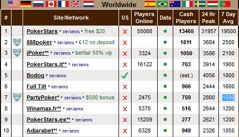 Согласно данным PokerScout, Party находится на седьмом месте в рейтинге румов и сетей. Среднесуточный показатель находится на отметке в 1 500 человек