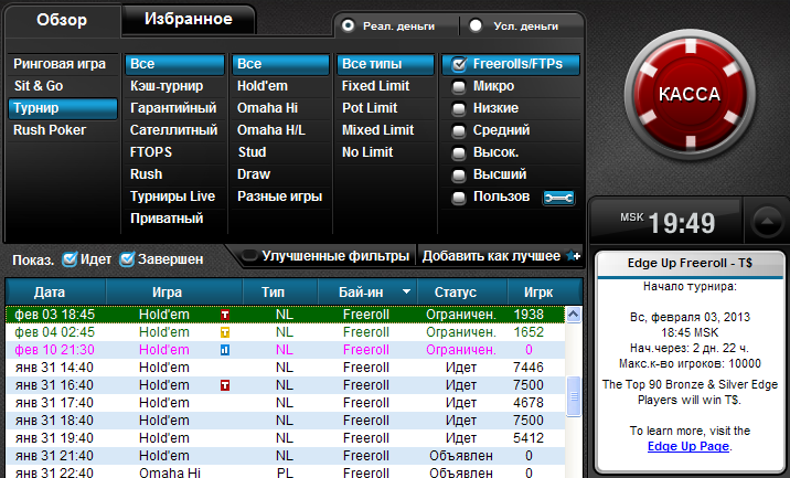 Если в течении января вы хотя бы один раз играли в руме на реальные деньги, то в феврале месяце Full Tilt Poker присвоит вам статус Silver Edge, даже если вы не набрали необходимое количество очков. Это предоставит вам право участия в данных фрироллах.